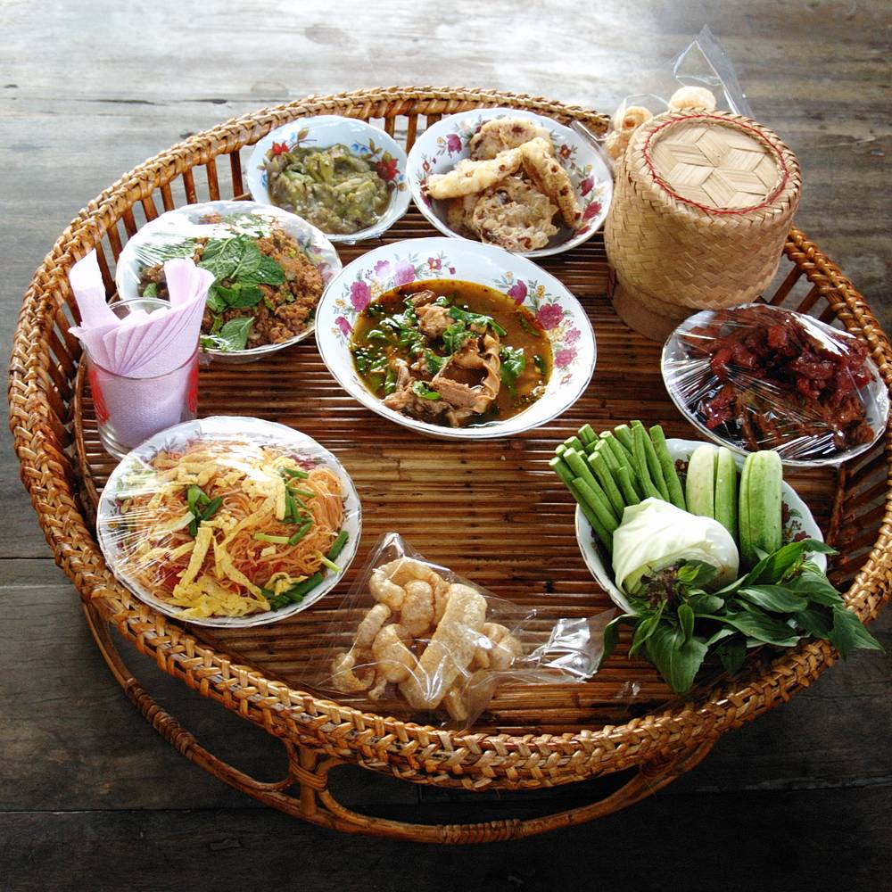 Eine typische Mahlzeit besteht in Thailand meist aus mehreren Gängen: einer Suppe, einem Curry-Gericht oder auch einem Salat als Zugabe. Dabei werden die Speisen nicht nach und nach gereicht, sondern oft zusammen auf dem Tisch serviert. Traditionell halten Thailänder den Löffel in der rechten und die Gabel in der linken Hand. Die Gable wird verwendet, um das Essen auf den Löffel zu schieben und nur der Löffel führt das Essen zum Mund.