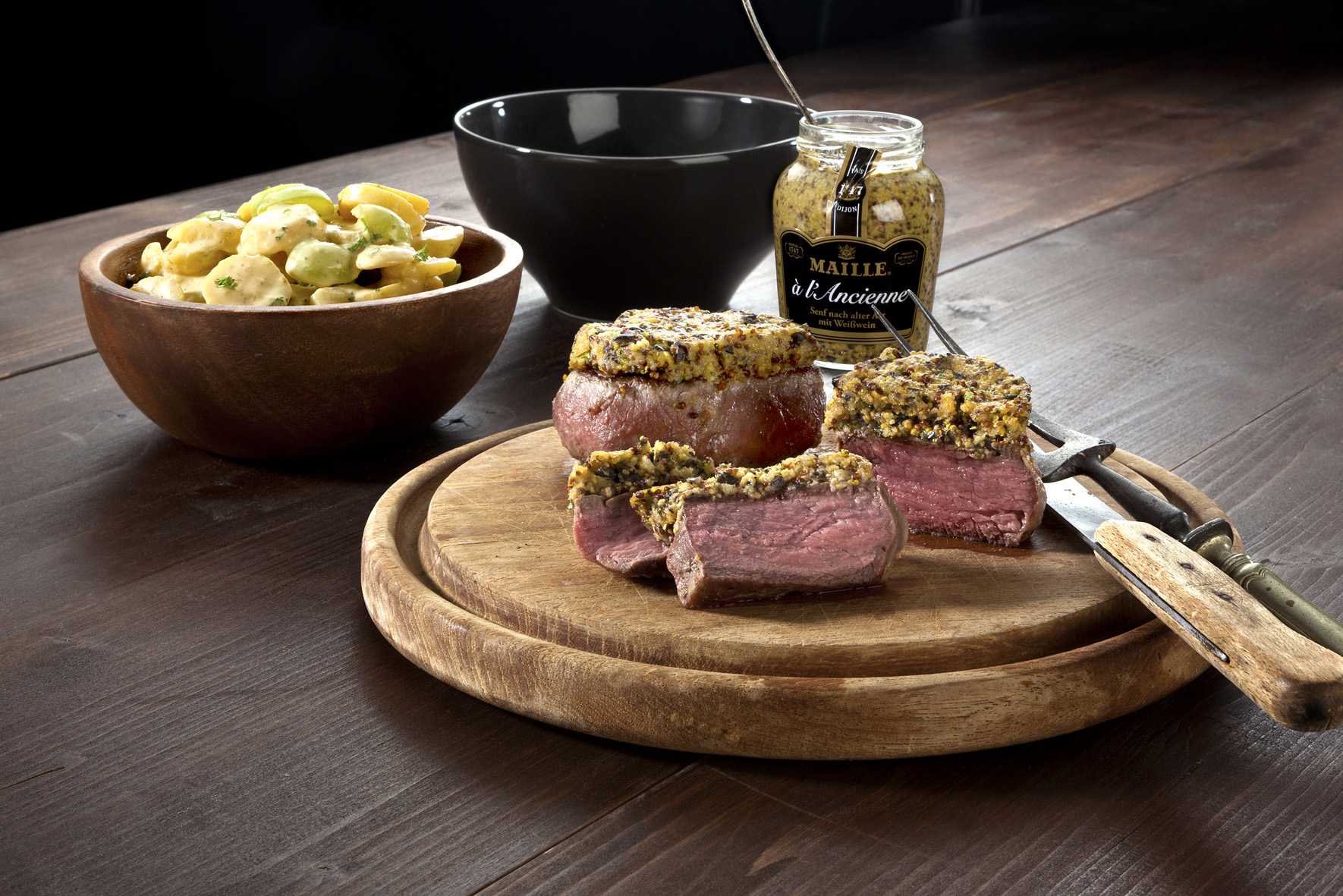 Kalbsfilet mit Senf-Oliven-Kruste und Kartoffel-Trauben-Salat