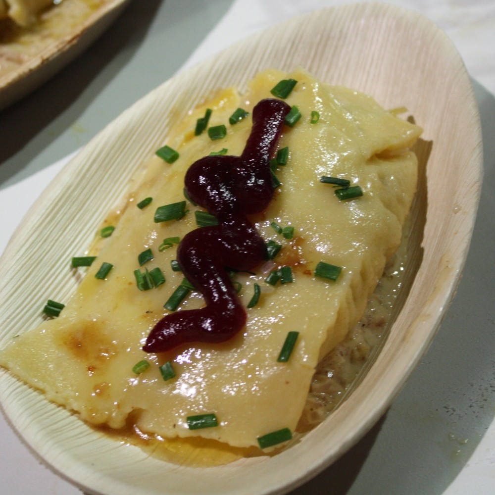 Aus dem Nudelteig auf einer Nudelmaschine eine lange Bahn rollen (ca. 1,5 mm dick). Fischfarce mit einem Spritzbeutel mittig auf den Nudelteig spritzen. Die Ränder vom Nudelteig mit Eigelb bestreichen und über der Fischeinlage zusammenlegen, so dass die typische Maultaschenform entsteht. Anschließend den Fischfond und den Weißwein aufkochen und die Maultaschen darin für 10 Min. garen lassen.